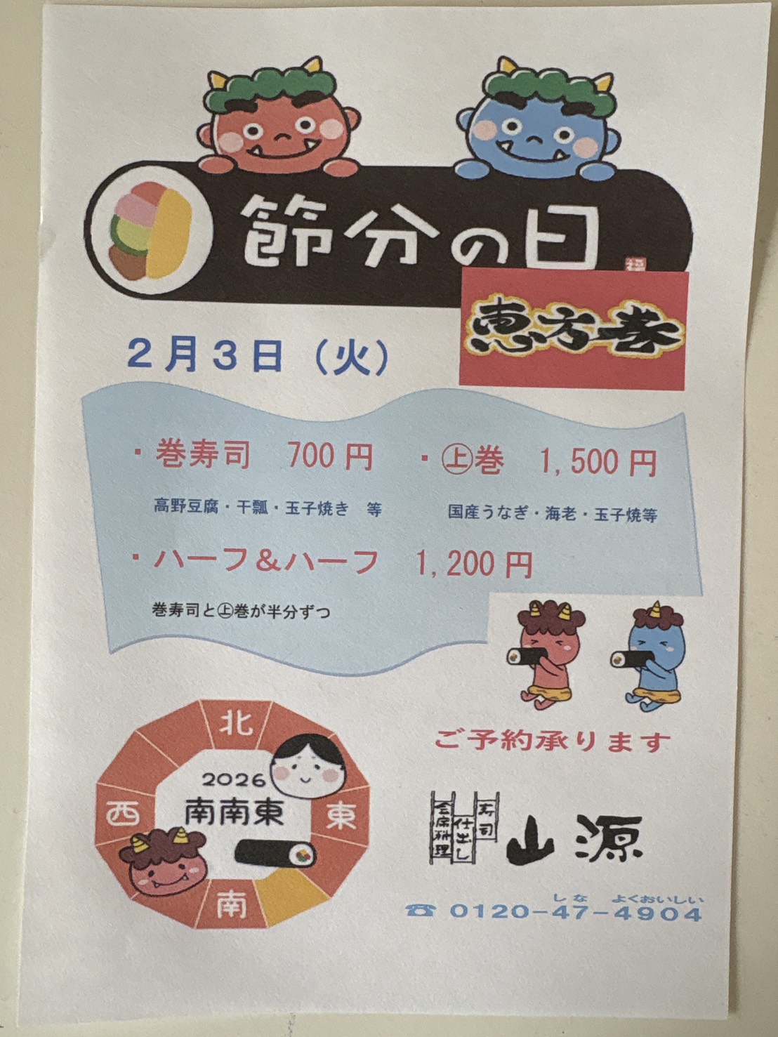2月3日(火) 節分の日 恵方巻 投稿者: yamagen_stuff2026年1月26日2026年1月26日未分類 2026年 恵方は『南南東』です ・巻寿司 700円 ・㊤巻 1,500円 ・ハーフ&ハーフ 1,200円 ※ご予約承ります!